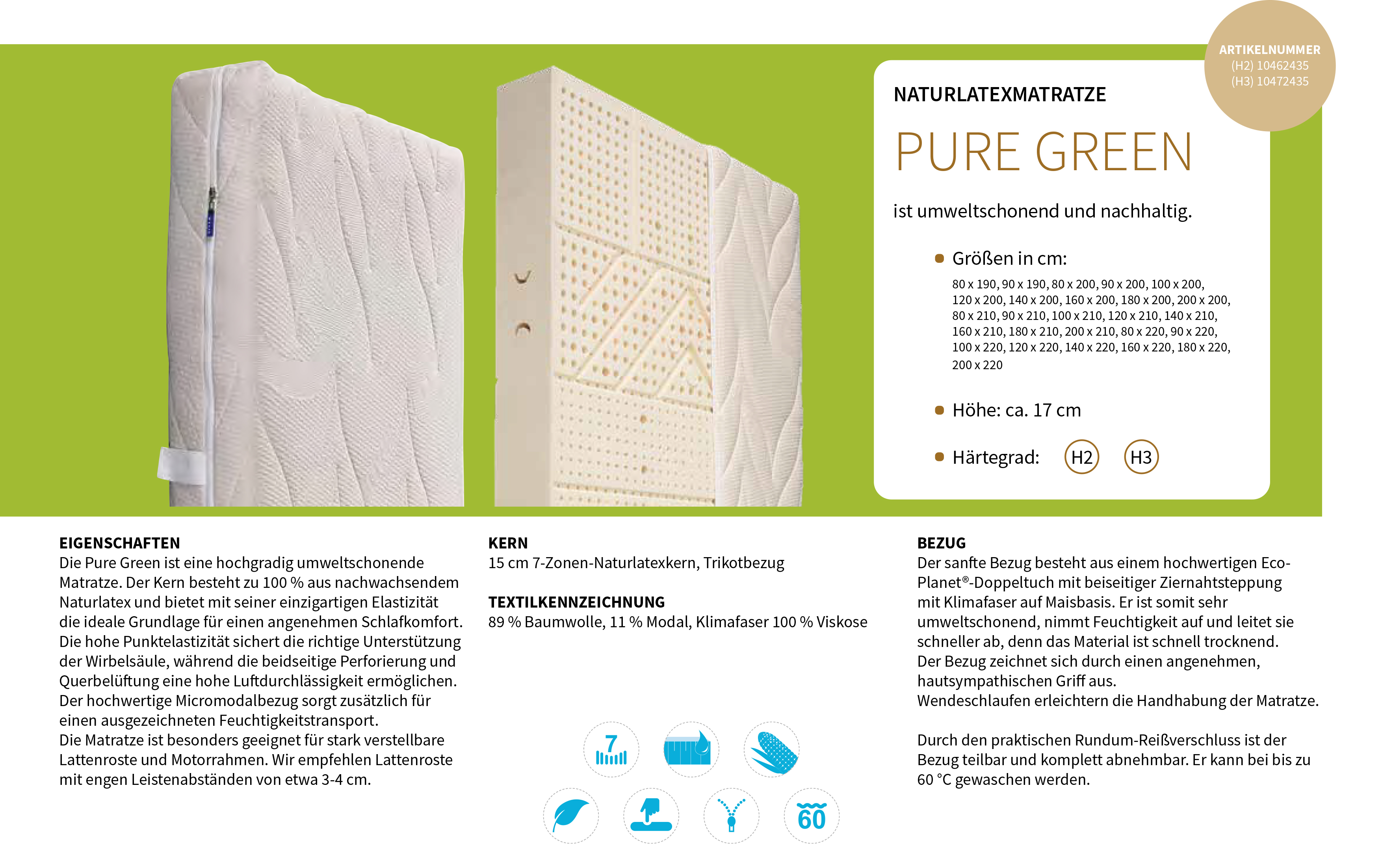 MALIE | Matratze | PURE GREEN Naturlatex (2 Kerne + 1 Bezug)