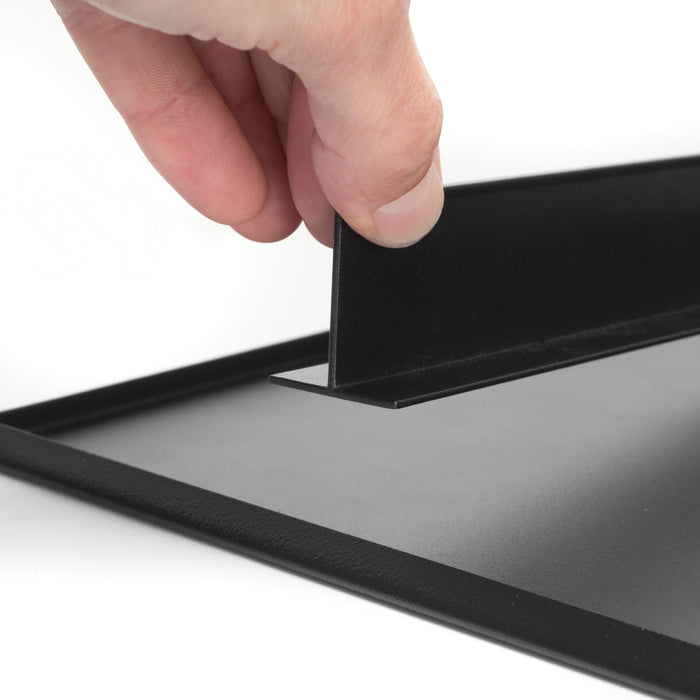 - Metalltablett aus Stahl, tiefschwarz lackiert. Es verfügt über Trennwände aus Stahl, die dank des Magnetstreifens an der Unterseite des Tabletts befestigt werden.