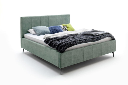 Polsterbett mit senkrechten Einzügen im Kopfteil, inkl. belüftetem Bettkasten und seitlich zu öffnende Federholzrahmen, 28 Leisten starr mit Härteg...