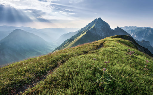 Die Sonnenstrahlen bestrahlen die wunderschöne Berglandschaft in den frühen Morgenstunden und erzeugen auf diese Weise ein faszinierendes Wandkleid...