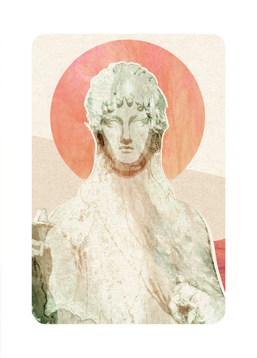 Ein Stück römischer Antike kehrt mit diesem Motiv nach Hause an die Wände der Bewohner. Die Statue wird von einem terrakottafarbenen Schein umrande...