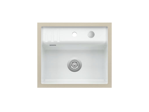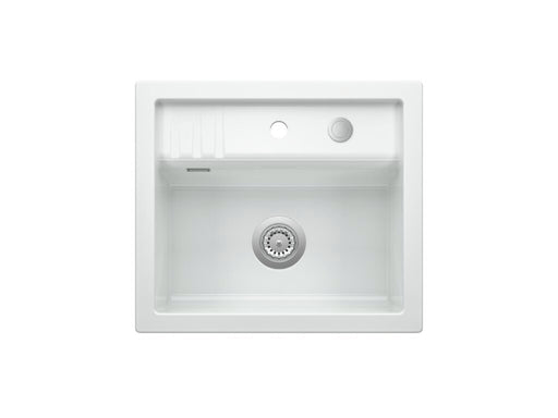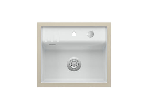 Einbauspüle, flächenbündig. Keramik, Einzelbecken mit kleiner Abtropffläche, 3½" Siebkorbventil mit Premium-Drehexzentergarnitur verchromt, Lochboh...