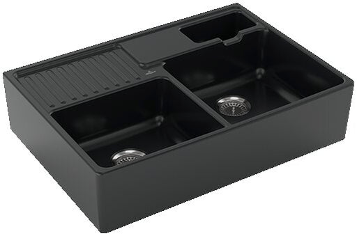 Vollständige Details anzeigenSpülstein, Keramik. Doppelbecken inkl. Resteschale, glasklar. 3½ Siebkorbventil, Drehexzentergarnitur, verchromt, Drehgriff edelstahlfarbig und Bef...