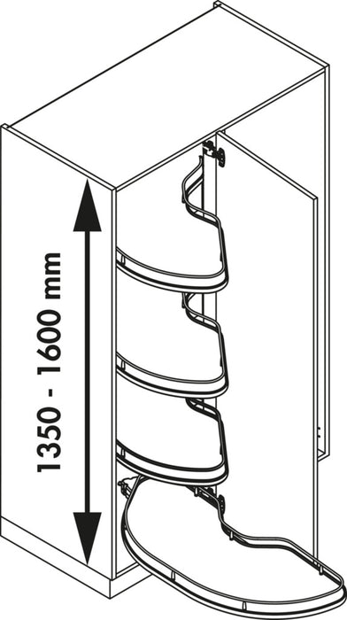 - Einbauhöhe 1350–1600 mm, Einbautiefe min. 490 mmBitte beachten Sie:Eckschrank-Schwenkbeschläge und Tablare müssen separat bestellt werden!