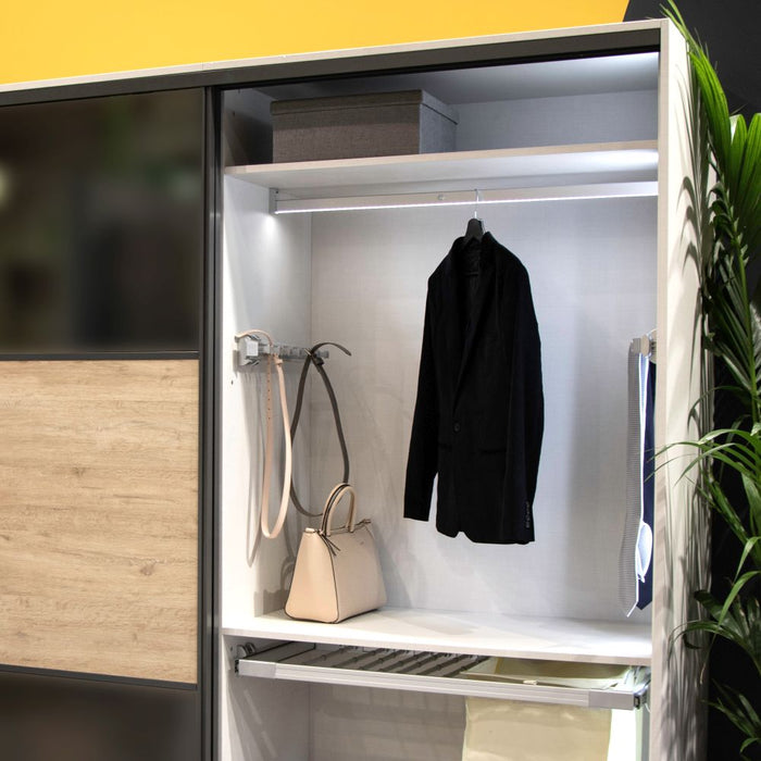 Der seitlich ausziehbare Gürtelhalter Keeper ist das ideale Accessoire, um für Ordnung im Kleiderschrank zu sorgen. Dank des Auszugs sind Gürtel stets zur Hand.