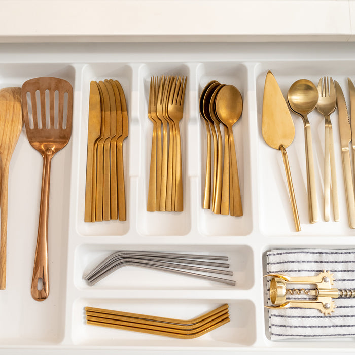 Besteckhalter für Vertex- und Concept-Küchenschubladen mit geradem Design und großer Aufbewahrungskapazität für Besteck und andere Küchenutensilien, um den Platz optimal zu nutzen. Zur Verwendung mit Schubladen, die auf Modulen mit einer Breite zwischen 400 mm und 1000 mm, einer Tiefe von 500 mm und einer 16 mm dicken Spanplatte montiert sind. Aus weißem und anthrazitgrauem Kunststoff.