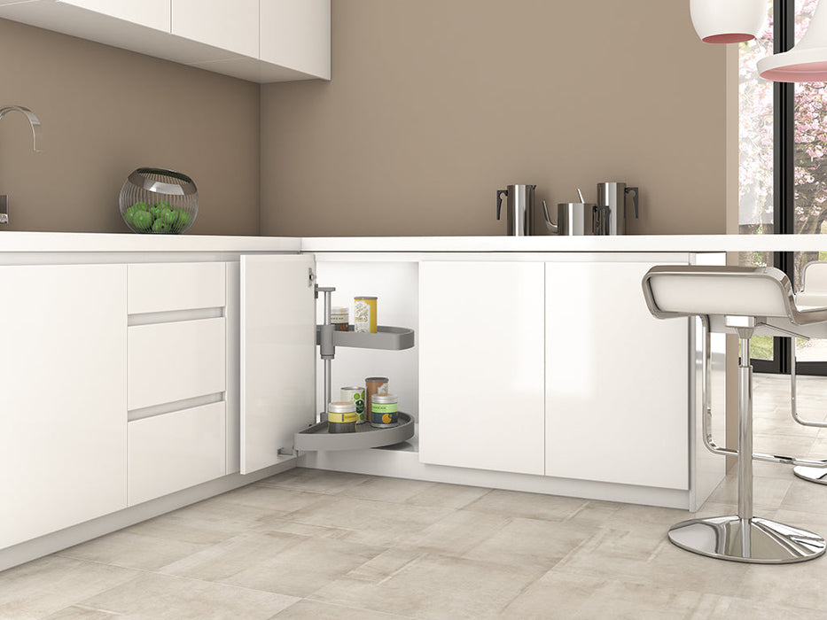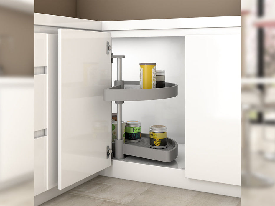 Drehbare Ablagen Halbmond zur optimalen Platznutzung in L-förmigen Kücheneckschränken. Sie sind leicht anzubringen und eignen sich für unterschiedliche Modulhöhen. Sie sind erhältlich für Module mit 800 mm und 900 mm und in den Farben weiß und grau . Das System besteht aus 2 Ablagen und Montagezubehör aus recycelbarem und antistatischem Kunststoff mit enormer Widerstandsfähigkeit gegen äußere Einflüsse und UV-Strahlen: in der Mitte befindet sich eine matt eloxierte Aluminiumstange. Sie verfügen über eine Tragkapazität von 20 kg je Ablage.