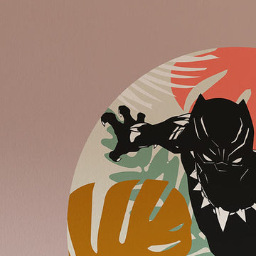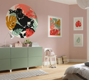 Black Panther versteckt sich auf der runden Fototapete hinter bunten Blättern. Der König von Wakanda ist einer der beliebtesten Marvel-Charaktere und macht so schnell niemand etwas vor.