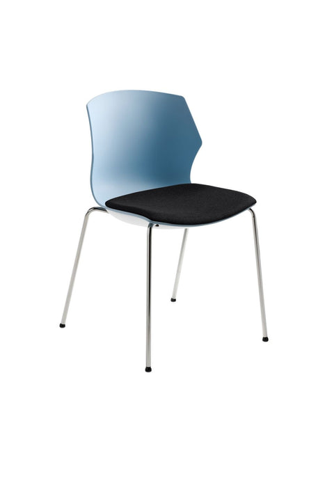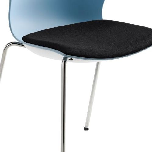 4-Fuß-Gestell Chrom, hochwertige Kunststoffschale graublau mit hohem Sitzkomfort, gepolsterter Sitz, stapelbar (bis zu 6 Stühle), Sitzhöhe 48 cm. Belastbar bis 150 kg.