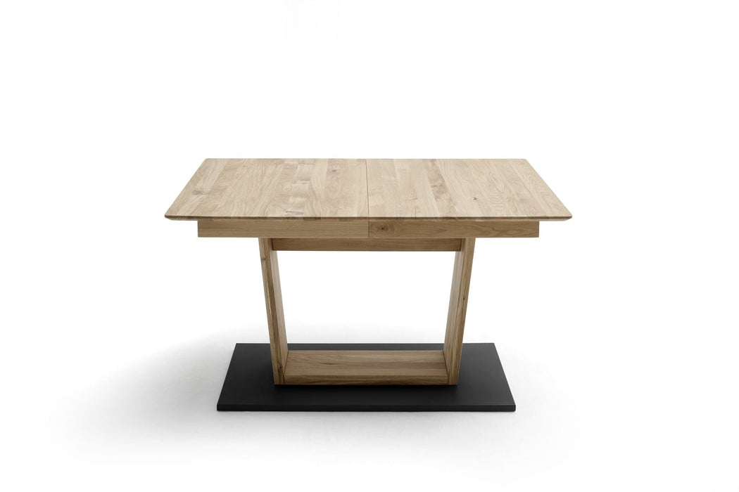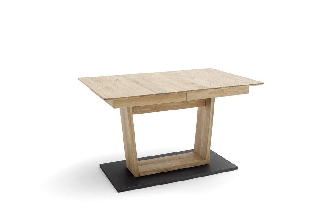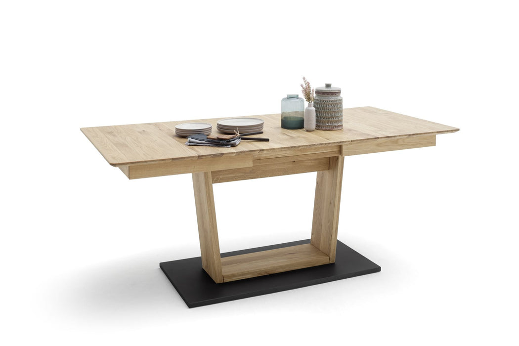 Esstisch ausziehbar von 180-230 cm mit Synchronauszug. Tischplatte Wildeiche massiv mit durchgehender Lamelle geölt. Tischplattenstärke ca. 25 mm mit Schweizer Kante. Bodenplatte in Schwarz-grau lackiert BxHxT 110x2,5x55 cm. Fußboden bis Zargenkasten ca. 66 cm. Mit 1 Einlegeplatte a 50 cm im Zargenkasten. Flächenbelastung ca. 50 kg. Stellmaß BxHxT 180-230x77x90 cm. Tischplatte mit Auszug bereits vormontiert. Die Lieferung erfolgt zerlegt inkl. Aufbauanleitung