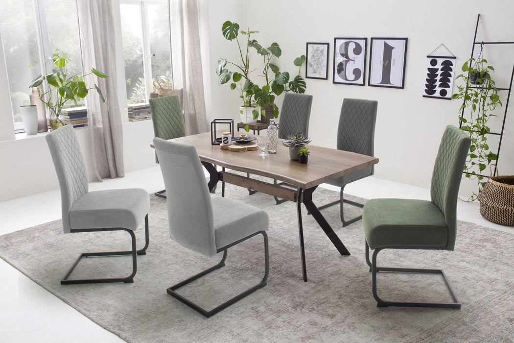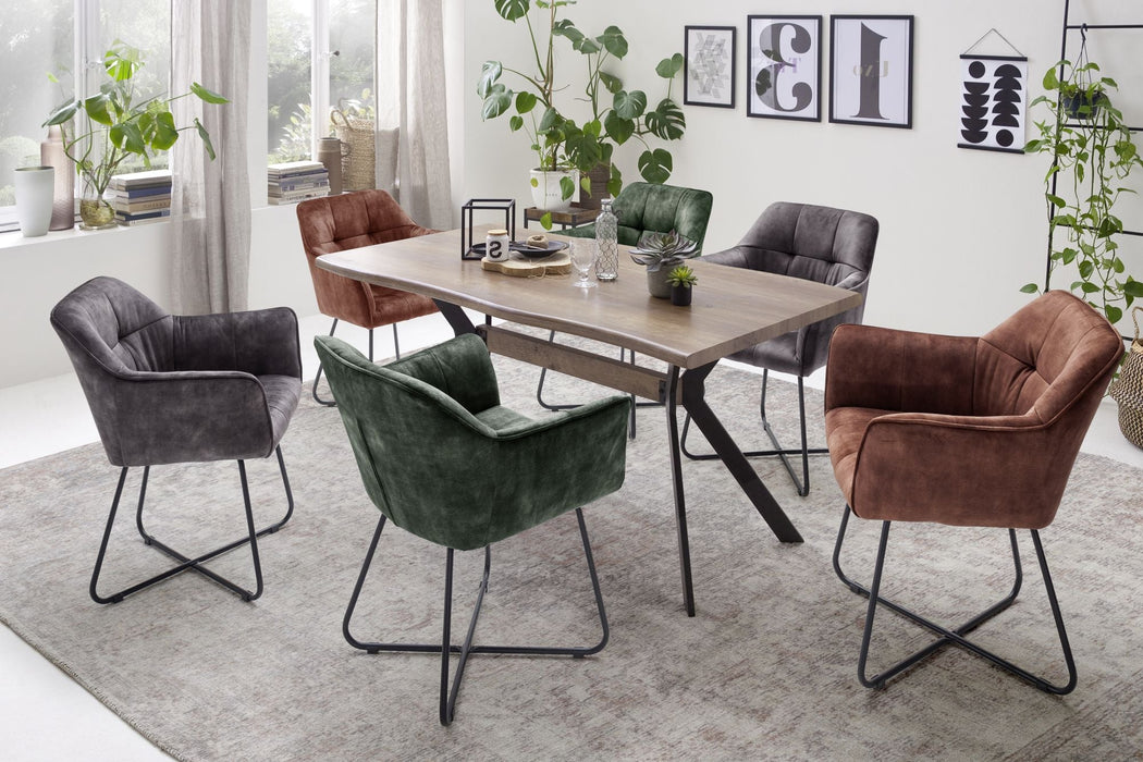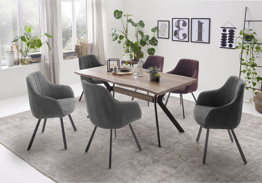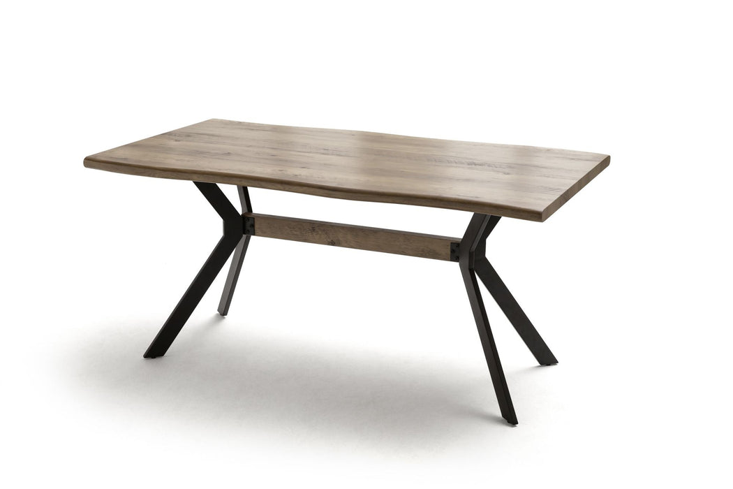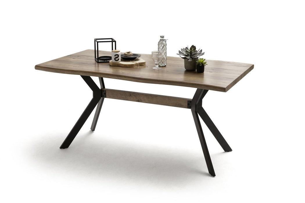 Esstisch mit Baumkante in MDF foliert. Gestell Metall Kantrohr in schwarz matt lackiert. Flächenbelastung bis ca. 50 kg. Tischplatte mit Baumkantenoptik in Wildeiche Antik Nachbildung . Fußboden bis Unterkante Tischplatte ca. 72 cm. Stellmaß BxHxT 160x76x90 cm. Die Lieferung erfolgt zerlegt inkl. Aufbauanleitung