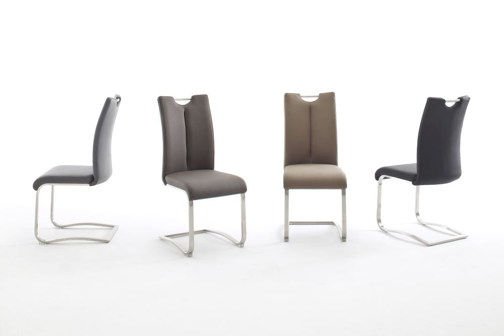 Schwingstuhl 2-er Set mit Griffloch mit Gestell Flachrohr in Edelstahl gebürstet. Bezug in pflegeleichten Kunstleder. Stuhl bis max. 140 kg belastbar. Sitz BxHxT 45x48x47 cm, Stuhlmaß BxHxT 45x102x58 cm, Nettogewicht pro Stuhl ca. 9,4 kg, Stuhl wird zerlegt geliefert inkl. Aufbauanleitung