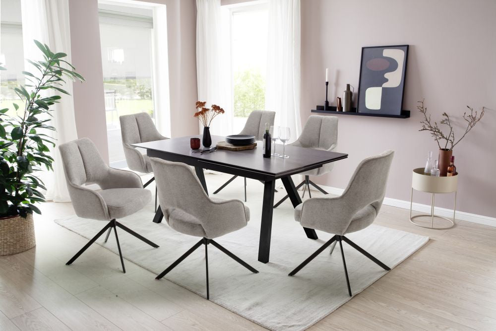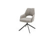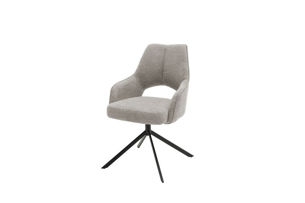 Esszimmerstühle 2er-Set mit Stoffbezug in Chenille Optik. Stuhl mit Armlehnen und Keder in Stuhlfarbe. Polsterstuhl mit Rückenöffnung für ein einfaches Handling. Sitz 180°drehbar mit Nivellierung. Diese sorgt dafür, das sich der Stuhl automatisch wieder in seine ursprüngliche Position dreht. Sitz mit Taschenfederkernpolsterung. Stul bis zu maximal 120 kg belastbar. Sitzpolsterung mit Taschenfederkern. Belastbar bis 120 kg. Nettogewicht ca. 12 kg. Gestell in Metall Ovalrohr in schwarz matt lackiert. Sitzmaß BxHxT 48x49x46 cm, Stellmaß BxHxT 57x89x66 cm. Die Lieferung erfolgt zerlegt inkl. Aufbauanleitung