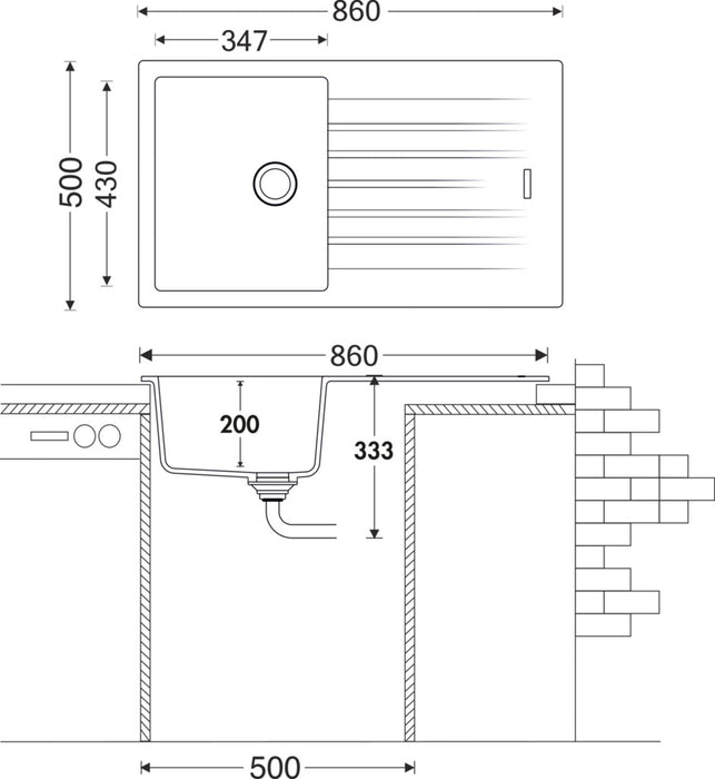 Einbauspüle. Composite, mit Abtropffläche, reversibel. 3½" Siebkorbventil mit Drehexzentergarnitur, verchromt.