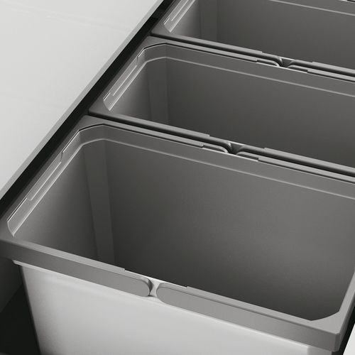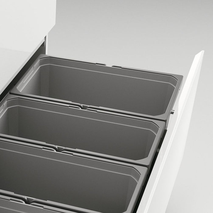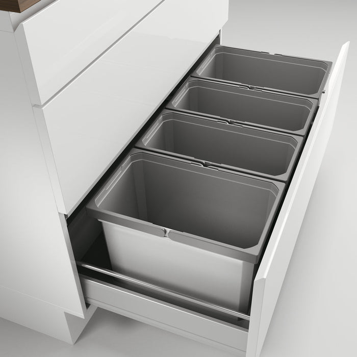Zur Montage auf vorhandenen Auszügen. Mit Antirutscheinlegematte und feststehendem Gesamtdeckel, Abfallvolumen 56 (2x16+2x12) Liter, Eimerhöhe 256 mm, Gesamthöhe 275 mm, Gesamtdeckel kann hinter oberer Front platzsparend montiert werden, passend für Cox Work® Utensilienbox