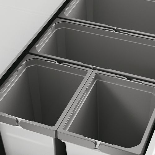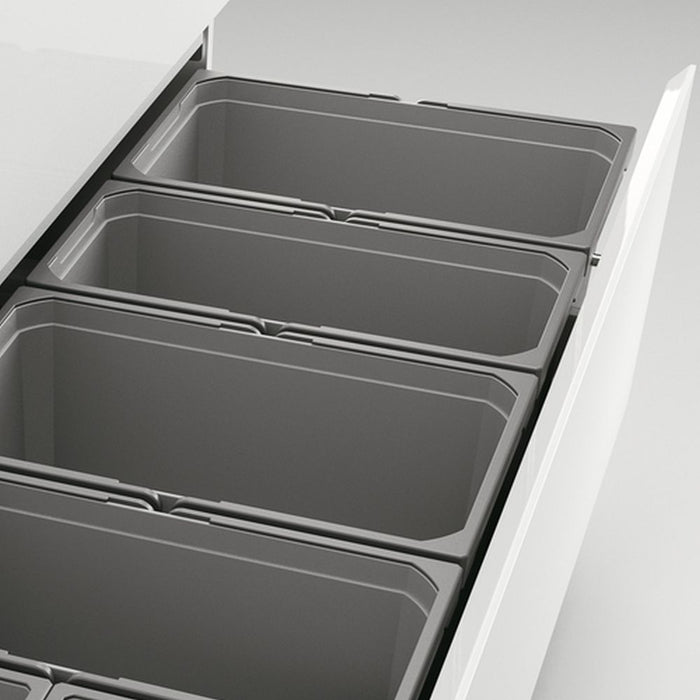 Zur Montage auf vorhandenen Auszügen. Mit Antirutscheinlegematte und feststehendem Gesamtdeckel, Abfallvolumen 70 (2x16+2x12+2x7) Liter, Eimerhöhe 256 mm, Gesamthöhe 275 mm, Gesamtdeckel kann hinter oberer Front platzsparend montiert werden, passend für Cox Work® Utensilienbox
