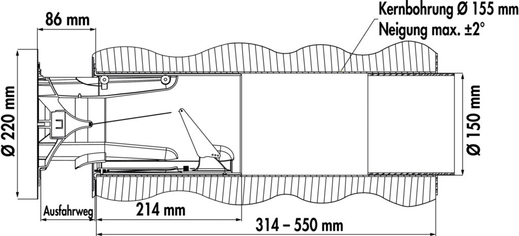 - Einbautiefe 314–550 mm, kürzbar bis 250 mm, Wanddurchbruch-Ø ca. 155 mm