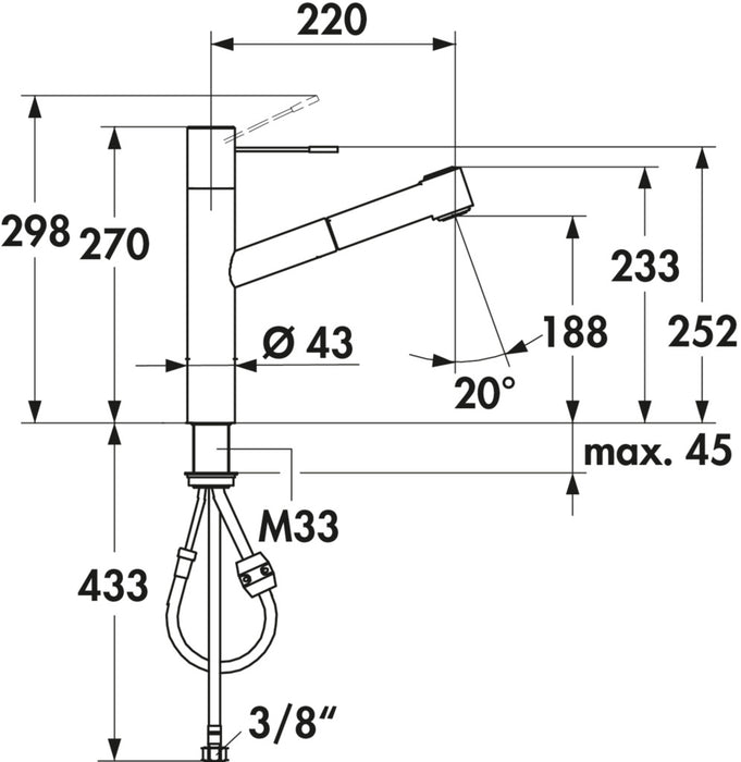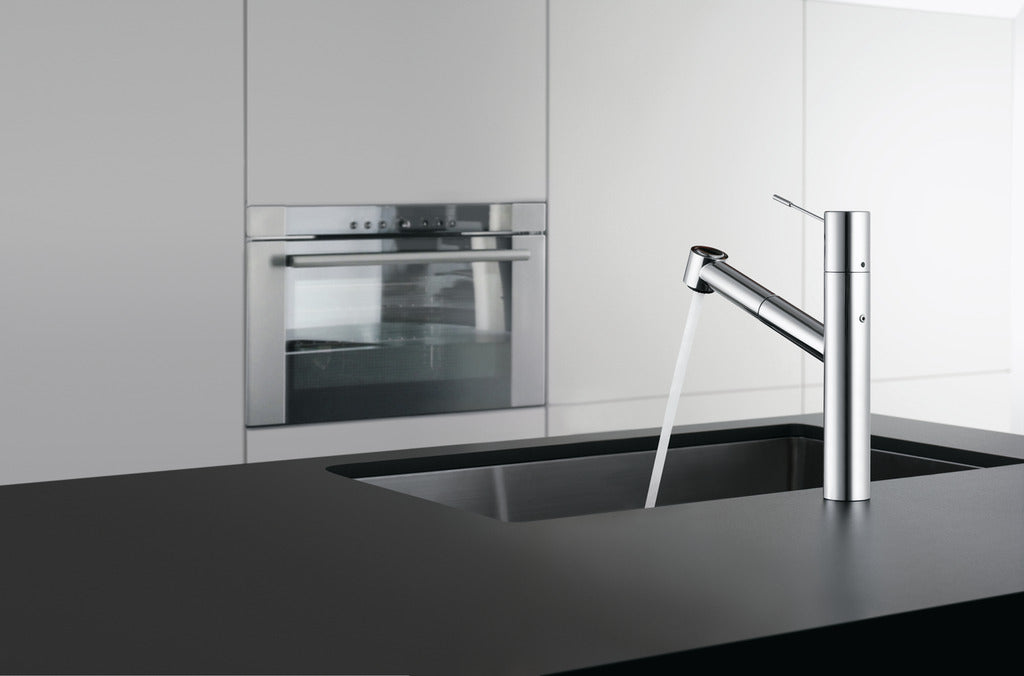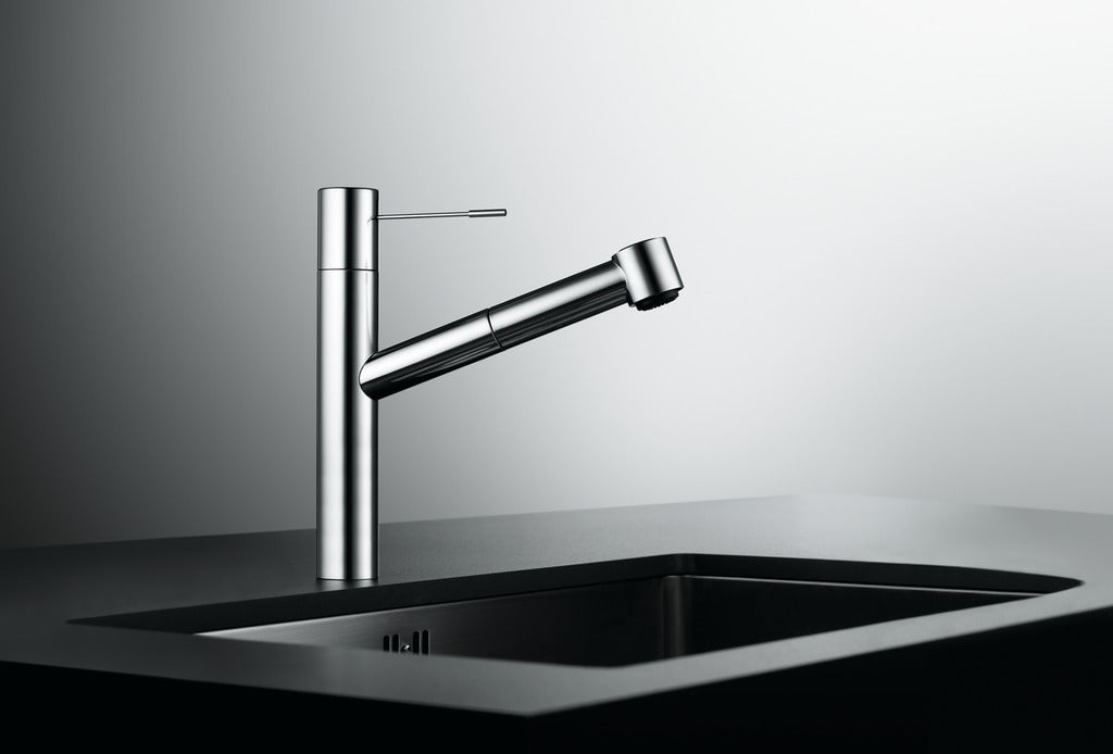 - Auszugbrause (SprayClean aktive Kalkbeseitigung und schnelle Siebreinigung, bis 700 mm ausziehbar, PowerClean Siebstrahlmodus, mit Rückstellautomatik, Schlauchoberfläche passend zu Armaturoberfläche)
