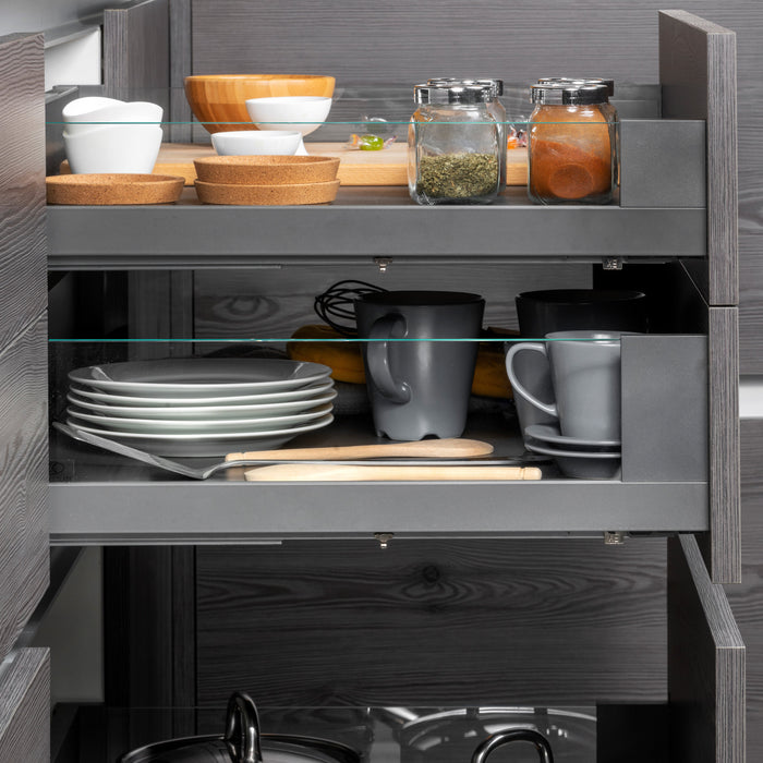 Vertex-Schublade mit transparenten Glasseiten für Ihre Küchenmöbel. Sie haben ein elegantes geradliniges Design in Anthrazitgrau und sind in verschiedenen Schubladenhöhen und -tiefen erhältlich.