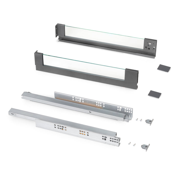 Enthält Führungsschienen, einen Satz Rippen mit Glasseiten, einen Satz Abdeckkappen und einen Satz Fronthaken für Außenschubladen.