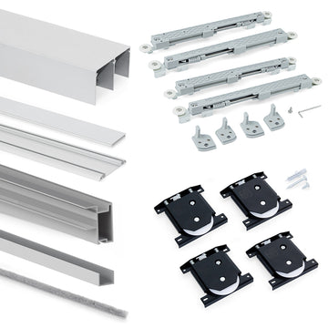 Kit für Schrank Placard mit zwei Schiebetüren einschließlich aller Beschläge und Profile zur Montage und Anbringung außer den Brettern. Mit diesem System aus Beschlägen und Profilen können Sie Ihren eigenen Schrank oder Kleiderschrank mit zwei von innen gestützten, sanft und leise gleitenden Türen konstruieren. Das Schiebetürensystem Placard verfügt über untere Rollen mit Kugellager aus Stahl, eine Türhöhenregulierung um + 5 mm und eine Vorrichtung zum Blockieren der Feder, was die Anbringung erleichtert. Beinhaltet einen Gleitschutz dank einer Feder am unteren Schlitten und einer anpassbaren Antisprung-Abdeckung an der oberen Rolle.Darüber hinaus enthält er eine Bremsvorrichtung zum Öffnen und sanften Schließen der Türen mit einer maximalen Traglast von bis zu 30 kg pro Tür. Dank des Hydraulikkolbens verfügt das System über eine größere Haltekraft, was für fortschrittliches und effizientes Schließen sorgt. Zum Einbau der Türen enthält die Lieferung ein U-förmiges vertikales Profil und Profile für die Griffe Sharp aus matt eloxiertem Aluminium für Türen mit einer Stärke von 16 mm.