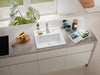 Einbauspüle. Keramik, Einzelbecken mit kleiner Abtropffläche, 3½" Siebkorbventil mit Premium-Drehexzentergarnitur verchromt, Lochbohrung 1 + 2 durchgebohrt.