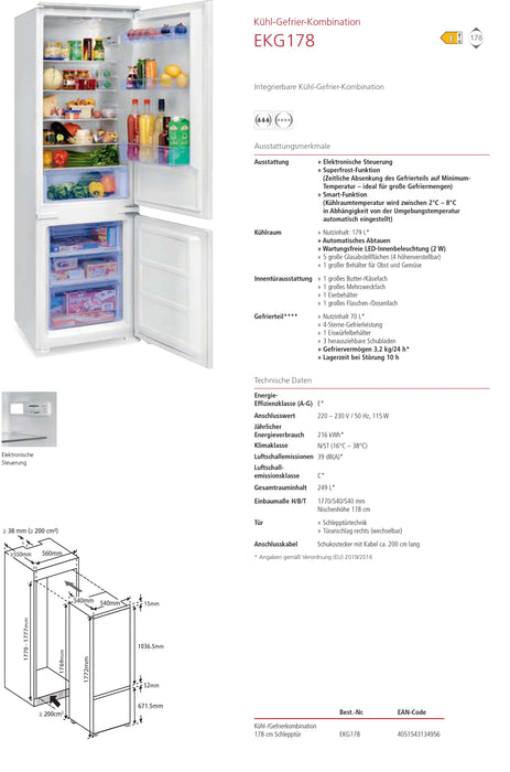Einbau Kühl-Gefrier-Kombination, Nischenhöhe 178 mm, Schlepptüttechnik, Elektronische Steuerung, Superfrost-Funktion, Smart-Funktion, automatisches Abtauen, LED-Innenbeleuchtung, Gefrierteil****, Lagerzeit bei Störung ca. 10 h, EEK: E, u. v. m..