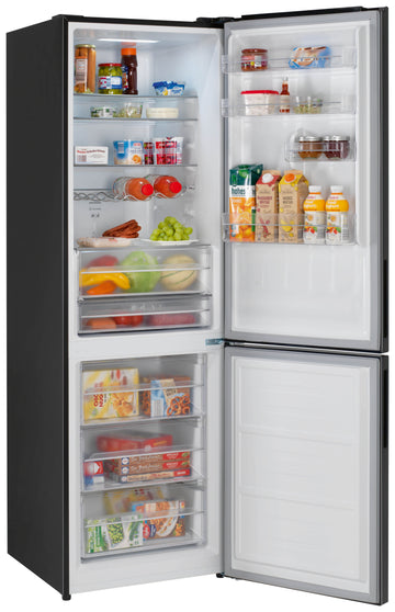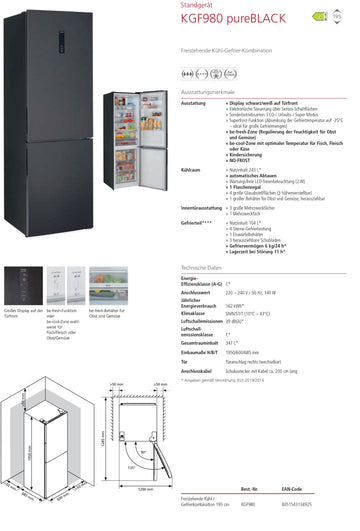 Stand Kühl-Gefrier-Kombination pureBLACK 195 mm, NO-FROST, be-cool-Zone, Elektronische Steuerung, be-fresh-Zone, Super-Frost-Funktion, Urlaubsmodus, Flaschenregal, automatisches Abtauen, LED-Innenbeleuchtung, Gefrierteil****, Lagerzeit bei Störung ca. 11 h, EEK: C, u. v. m..