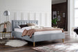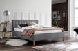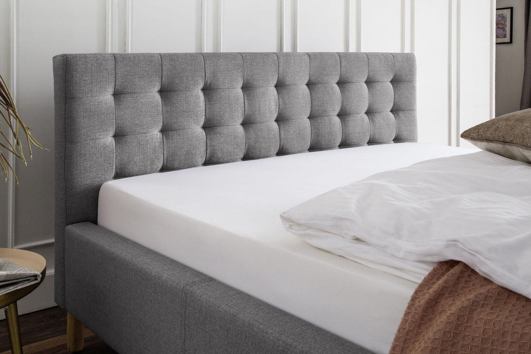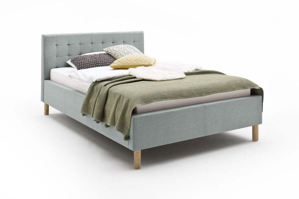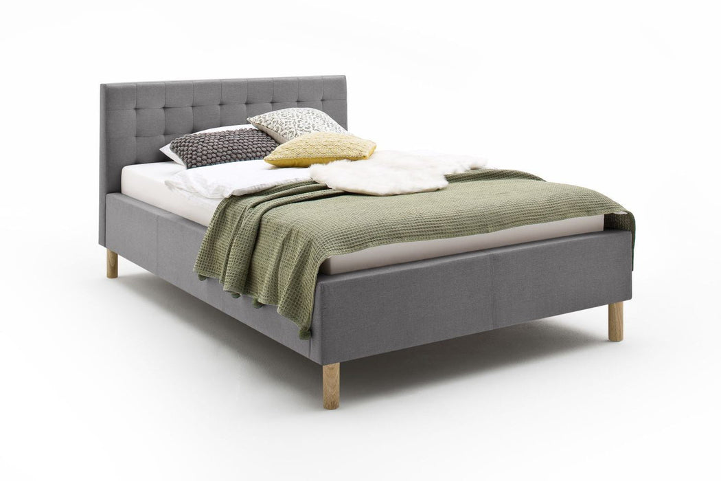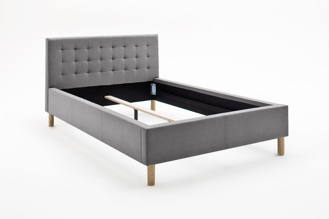 Polsterbett mit hochwertigem Stoffbezug, Kopfteil gesteppt, Holzfüße eichefarbig, Bett Belastbar bis 120 Kg, Einlegetiefe: ca. 14 cm, Oberkante Bettseite: ca. 40 cm, Kopfteilhöhe: ca. 93 cm