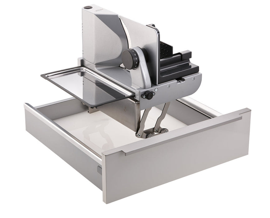 - Zubehör: Schneidgut-Auffangschale aus Edelstahl rostfrei, Haltewinkel für Fingerschutz und Restehalter