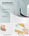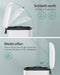 • Wenn man den Mülleimer mit der Hand öffnet, geht der Deckel ungefähr um 90 Grad auf, um den Inneneimer rauszuholen. Wenn man ihn mit dem Fuß bedient, sind es etwa 70-75 Grad. Deshalb ist ein Abstand von ca. 4 cm zur Wand notwendig, damit er beim Öffnen nicht dran stößt.Mit dem Loch an der Hinterseite des Innenbehälters kann der Rand des Müllsackes gespannt werden.